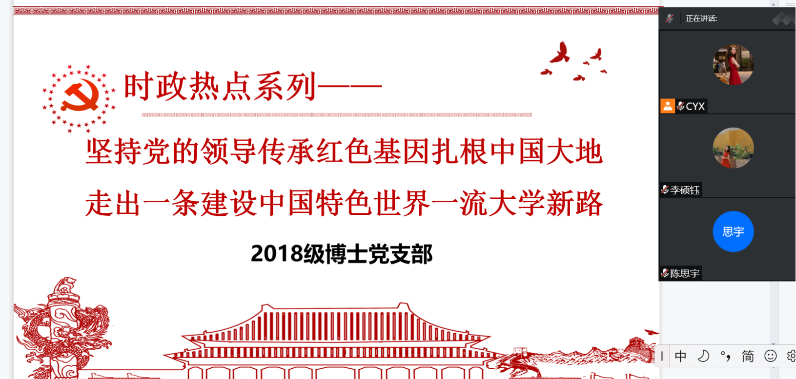 5月8日中午,w88win优德2018级博士班党支部开展线上主题党日学习活动,本次党日活动以“坚持党的领导 传承红色基因 扎根中国大地,走出一条建设中国特色世界一流大学新路”为主题。