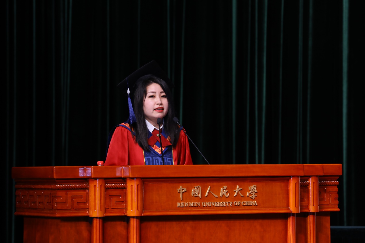 赵稳对学校深情告白道,在人大成长的每一天、每一刻、每一分,学习、考试、论文答辩苦乐并存、忧喜交加,但这些难忘的回忆奏响了生命的交响曲,见证了人大学子成长的点点滴滴,点点滴滴里渗透着追求卓越、勇攀高峰、励志进取、无往不胜的勇气和决心。她提议,同学们将掌声献给辛勤付出的老师以及一直以来都在努力拼搏、不忘初心的自己。