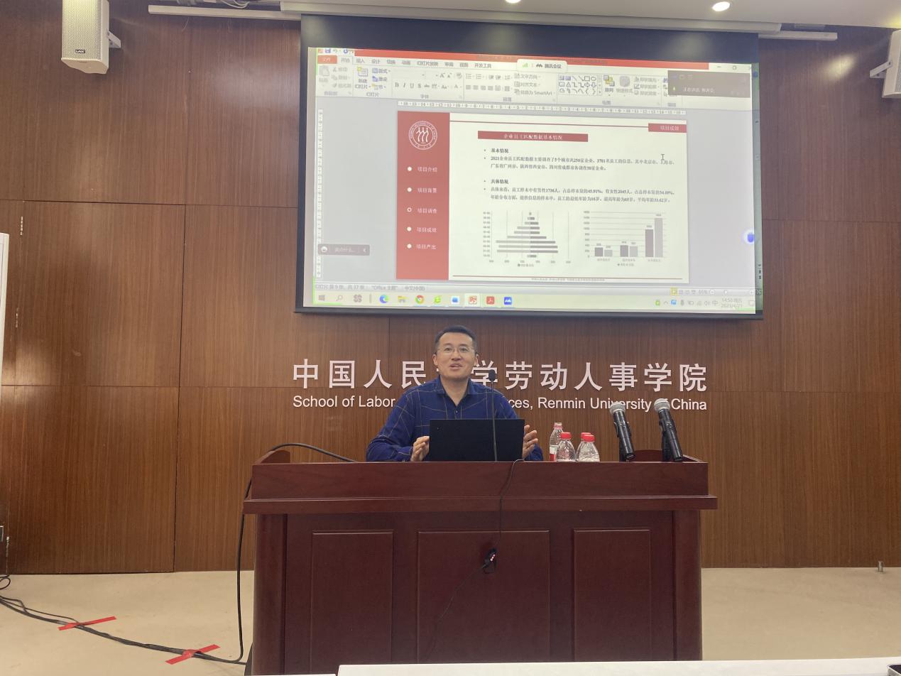 接着,劳动经济系韩军副教授详细介绍了2021年调查项目的数据情况。他指出员工人力资本、劳动关系和社会保障情况、绩效与薪酬和管理模式等是调查项目的重点。韩军副教授还进一步对2021年调查样本进行描述性统计分析,如不同类型企业劳动力的年龄和性别构成、员工身体与心理健康状况、不同特征劳动力的专业匹配情况、家庭生育意愿等。